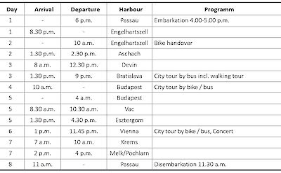 Extra options Guided tour of Vienna by bike € 35 Guided tour of Budapest by bike € 45 Guided tour of Vienna by bus € 48 Excursion package* € 63 Discount amount Price Discounts for triple & quad cabins On request *Excursion package includes: Guided bus tour of Budapest and guided walk in Bratislava (minimum participation 20 persons)