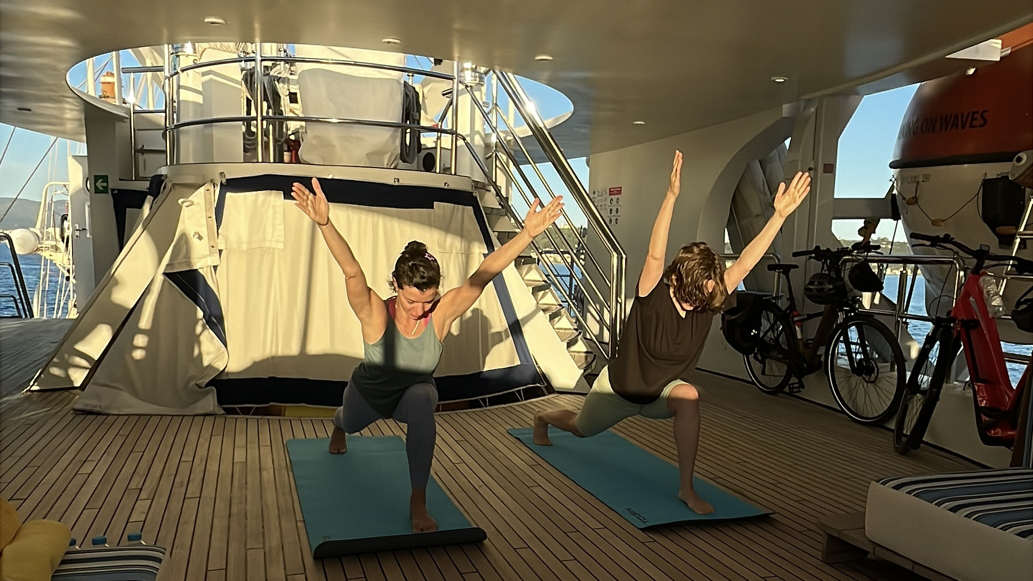 We biked every day — anywhere from 20 to 60 km — and the scenery blew me away. Endless olive groves, sparkling blue sea, quiet roads, and secret beaches you couldn’t reach without a bike. Morning yoga on deck was such a nice way to wake up and stretch before hitting the pedals.